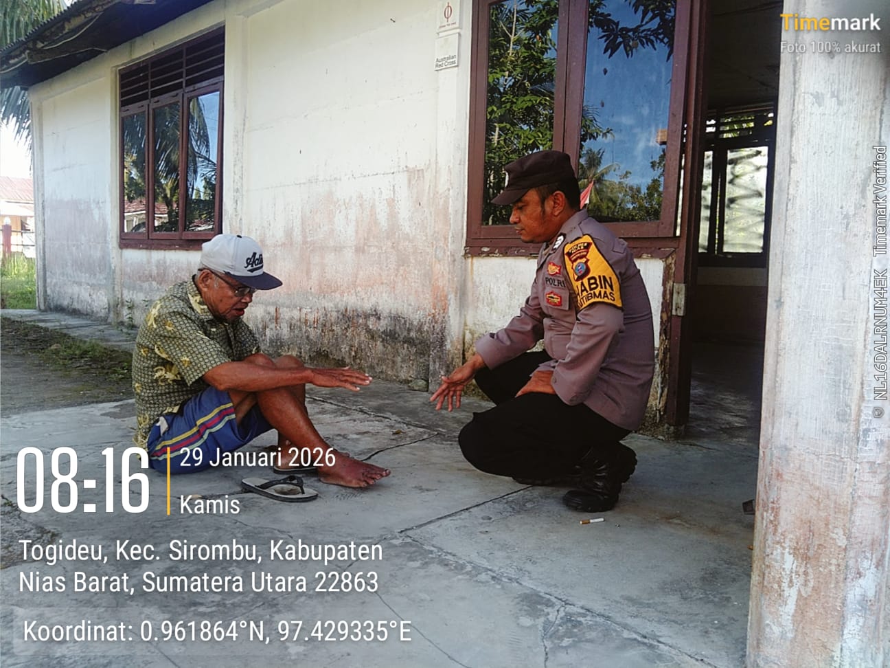 Nias Barat – Bhabinkamtibmas Polsek Sirombu, BRIGADIR Rully Dermawan, melaksanakan kegiatan sambang dialogis kepada warga masyarakat di Desa Togideu, Kecamatan Sirombu, Kabupaten Nias Barat.