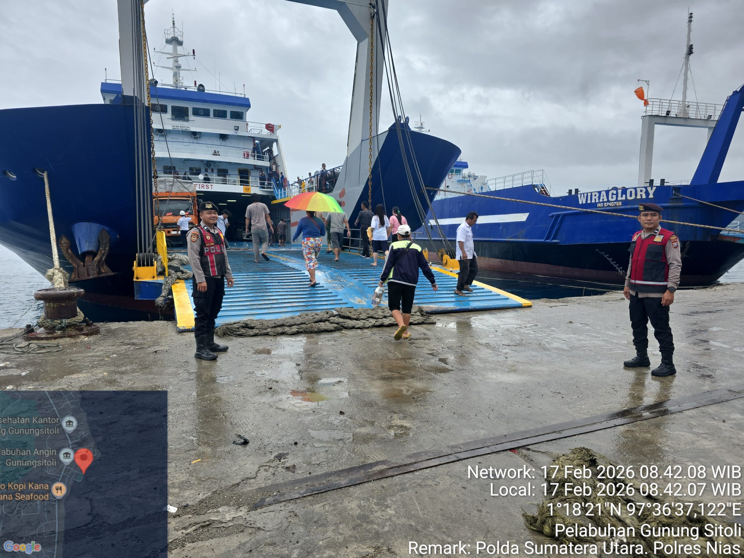 Gunungsitoli, Selasa 17 Februari 2026 – Guna memberikan rasa aman bagi para pengguna jasa transportasi laut, personel Sat Samapta Polres Nias melaksanakan pengamanan kedatangan kapal penumpang di Pelabuhan Angin, Kota Gunungsitoli pada pagi hari ini. Kegiatan pengamanan yang dimulai sekira pukul 07.00 WIB tersebut difokuskan untuk mengatur kelancaran arus penumpang dan kendaraan yang turun dari kapal serta mengantisipasi potensi gangguan kamtibmas di area pelabuhan.